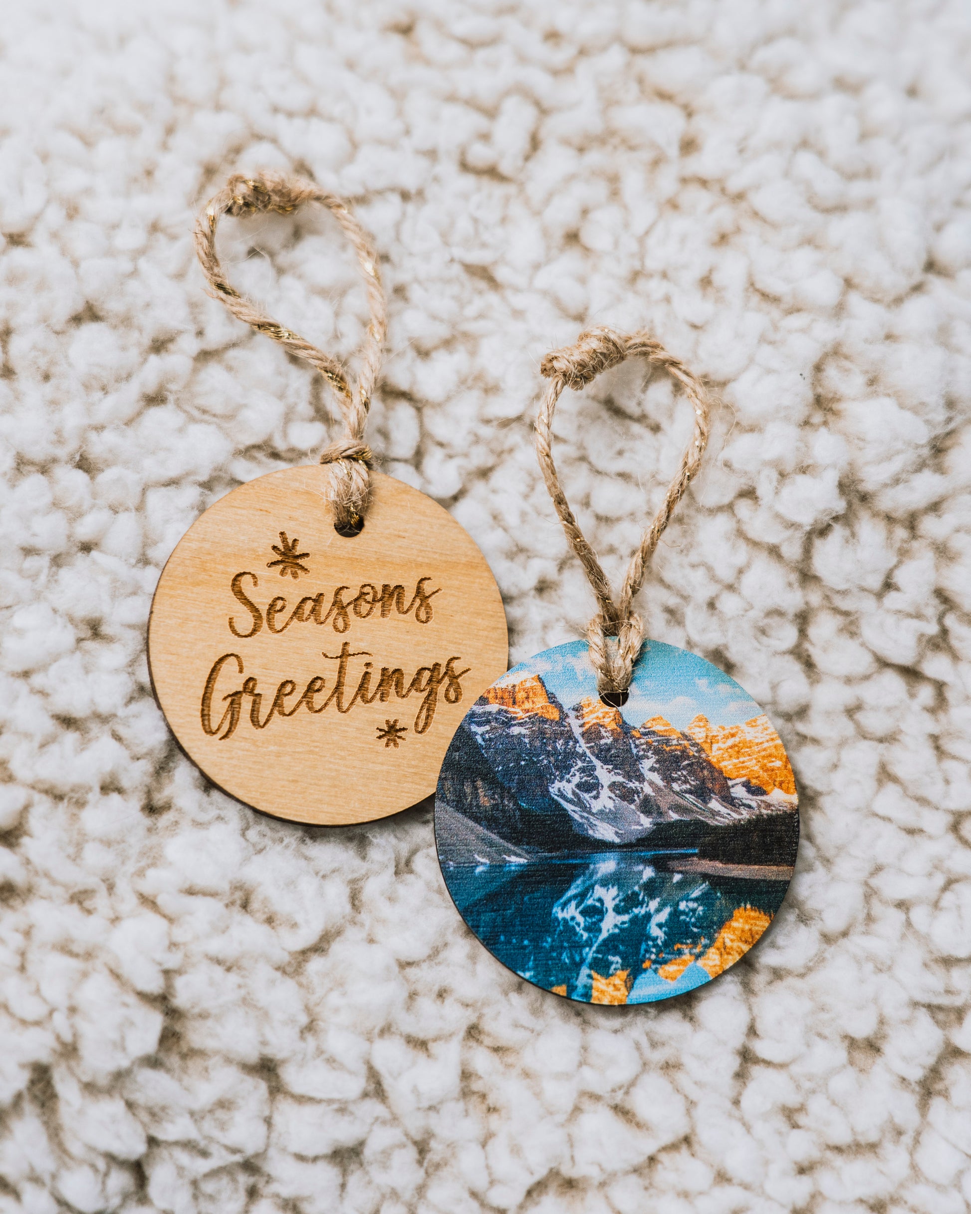 Circle Wooden Holiday Ornament Seasons Greetings Moraine Lake