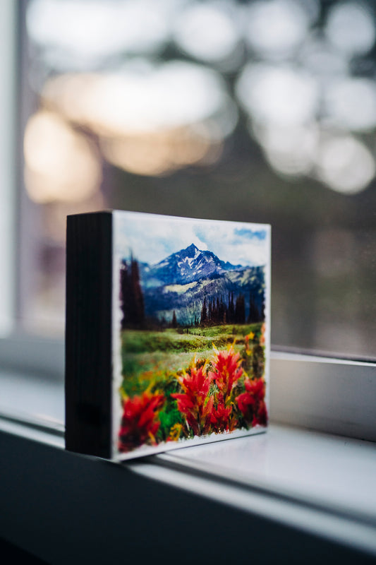 Three Sisters Mountains Sunset <br> 5x5" Signature Glossy Art Block <br> Rustic Barn Wood Edges
