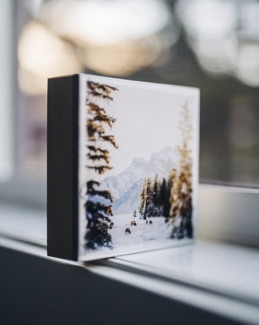 Winter Sunrise in Canmore with Elk <br> 5x5" Signature Glossy Art Block <br> New Pine Wood Edges